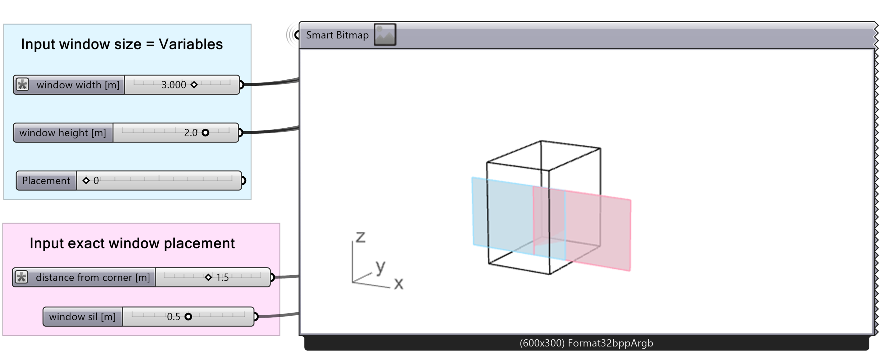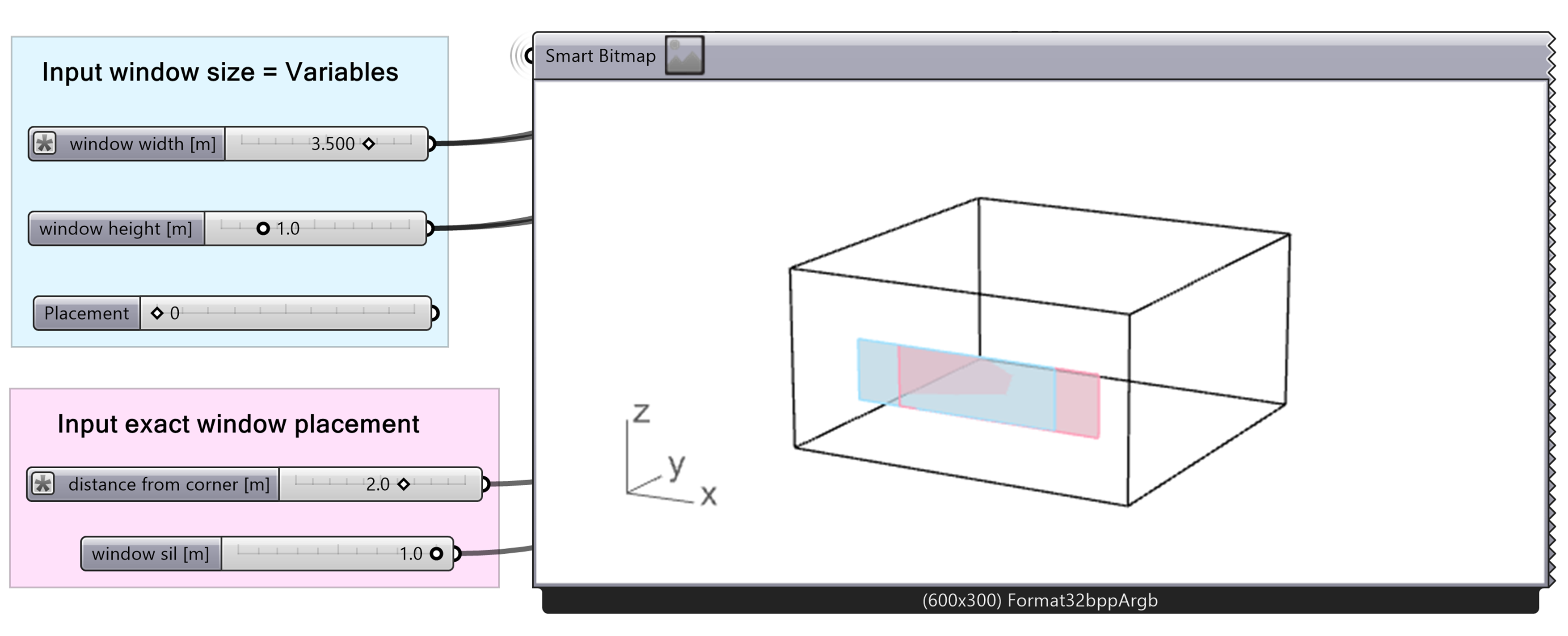 Now start by changing the window height. Do you see that the blue window stays in the middle while the pink window increases upwards. Additionally, making a 2.5m high window works for the blue window but not for the pink window. The variable constraint is dependent on the parameter you set.