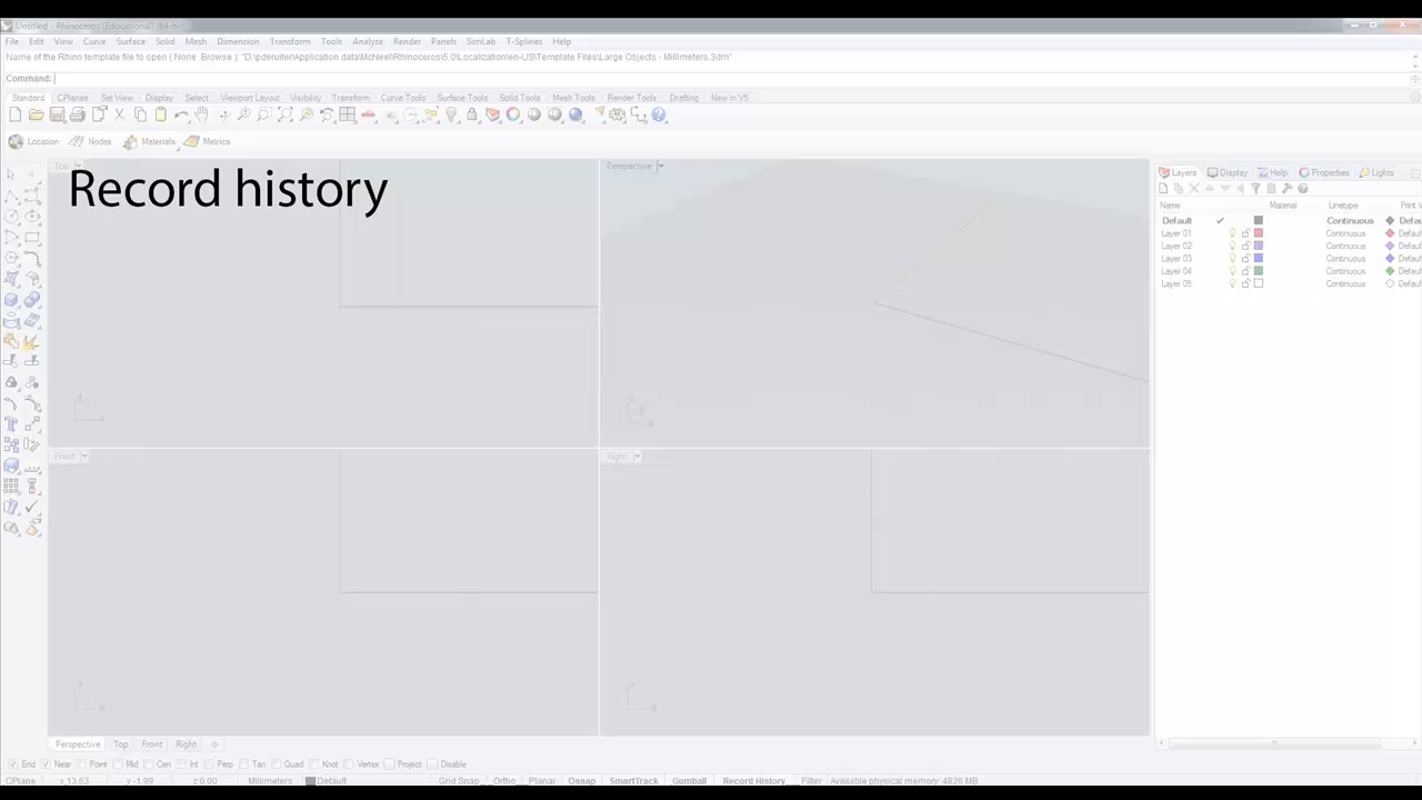 Don’t leave the Record History option turned on the whole time while working in Rhino; you will link all objects to each other. Imagine what happens if you suddenly move one of the first objects drawn, suddenly all objects will move relative to this object.